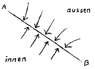 vlastitu prirodu. Dakle, ako pogledamo unutarnji svijet, u koji vanjski svijet kao da je sabijen, možemo reći: ovdje internalizirani vanjski svijet utječe na ljudsku krv. Ako to ponovno želimo nacrtati shematski, možemo naznačiti tablicu krvi pomoću dijagonalne linije A-B (vidi gornji crtež), gornjim strelicama možemo ilustrirati sve što dolazi izvana i ulazi u tablicu krvi, a donjim strelicama sve što dolazi iznutra i ulazi u tablicu krvi. Ili, ako želimo stvar promatrati malo manje shematski, možemo reći: ako pogledamo ljudsku glavu i krv koja teče kroz nju, kako je opisano, od izvana kroz osjetilne organe, rad mozga ima transformirajući učinak na krv na isti način kao što unutarnji organi transformirajući djeluju na krv. Jer ova tri organa,