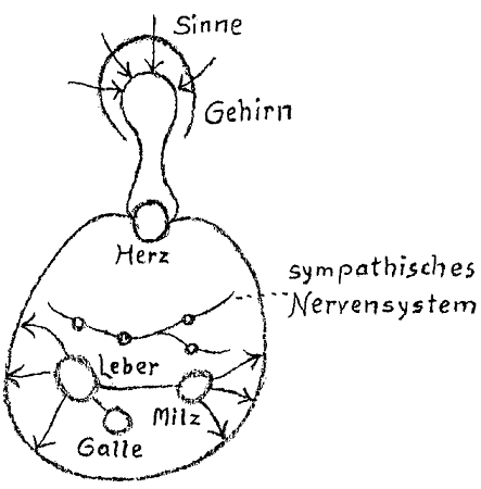 Dakle, jednostavno uspoređujući donji dio čovjeka s gornjim, možemo vidjeti da se mora pretpostaviti da se između naših unutarnjih organa - čiji predstavnici su ova tri organa: jetra, žuč, slezena - i krvotoka, mora uključiti nešto poput živčanog sustava. Ako pitamo vanjsko promatranje, ono nam zapravo pokazuje da je ono što zovemo simpatički živčani sustav integriran u sve te organe, koji ispunjavaju šupljinu ljudskog tijela, i koji stoji u analognom odnosu prema čovjekovom unutarnjem svijetu i krvotoku, kao što živčani sustav leđne moždine stoji između velikog vanjskog svijeta i ljudskog krvotoka. Iz tog simpatičkog živčanog sustava, koji u početku ide uzduž kralježnice, zatim, krenuvši odatle, prolazi kroz najrazličitije dijelove organizma i širi se, također pokazujući mrežasta širenja, posebno u trbušnoj šupljini, gdje se dio ovog sustava popularno naziva solarni pleksus, od ovog živčanog sustava moramo očekivati da se na određeni način razlikuje od drugog živčanog sustava. I u najmanju je ruku zanimljivo - čak i ako nije namjera da služi kao dokaz - zapitati se: kako bi ovaj živčani sustav mogao biti dizajniran u odnosu na živčani sustav leđne moždine, ako su ispunjeni ovi uvjeti koje smo sada pretpostavili? - Možete vidjeti: baš kao što se živčani sustav leđne moždine mora otvoriti perimetru prostora, ovaj simpatički živčani sustav mora biti sklon onome što je sabijeno u unutarnju organizaciju. Ako su naše pretpostavke ispunjene, simpatički živčani sustav odnosi se prema živčanom sustavu leđne moždine, na približno isti način kao što se radijusi kruga, koji su usmjereni od središta prema periferiji (vidi crtež a), odnose na one koji se protežu od