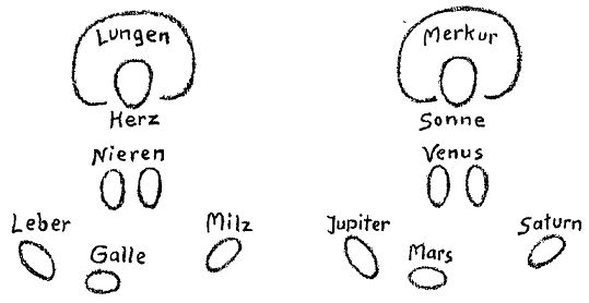 Već sam istaknuo - a vidjet ćemo detaljnije u kojoj je mjeri takav naziv opravdan - da su u okultizmu učinak slezene naziva učinkom Saturna, učinak jetre učinkom Jupitera, a žuči kao učinak Marsa. Iz istog razloga, okultno znanje u srcu i povezanom sustavu krvi, vidi ono što zaslužuje naziv 'Sunce' u ljudskom organizmu, jednako kao i Sunce vani u planetarnom sustavu. Prema istom principu, okultist naziva sustav pluća 'Merkur', a sustav bubrega 'Venera'. Dakle, imenovanjem ovih sustava ljudskog organizma - čak i ako ne idemo u opravdavanje tih naziva - već smo nagovijestili nešto poput sustava unutarnjeg svijeta, koji smo nadopunili stavljajući se u poziciju da također promatramo vezu između dvaju organskih sustava koji su povezani sa sustavom krvi. Tek kada pogledamo veze u tom smislu, vidimo ono što možemo nazvati stvarnim čovjekovim unutarnjim svijetom na cjelovit način. Sada ću vam na sljedećim predavanjima također morati pokazati da okultist zapravo ima razloga, odnos Sunca prema Merkuru i Veneri zamisliti na sličan način kao što treba zamisliti odnos između srca, pluća i bubrega u ljudskom organizmu.