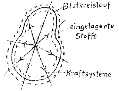 To znači da je formiranje krvotoka, cijelom prirodom njegove aktivnosti, određeno 'Ja' prirodom čovjeka. Ako zamislimo da je krvotok potpuno shematski prikazan u ovoj ovalnoj liniji (vidi crtež ispod), onda moramo reći da krvotok mora apsorbirati ostatak organizma, to jest svi organski sustavi moraju biti raspoređeni tako da se cirkulacija krvi može integrirati. Ne bismo imali svo tkivo naših krvnih žila - bilo na glavi ili nekom drugom dijelu našeg organizma - takvo kakvo jest, da odgovarajuće stvari koje tamo moraju biti nisu usmjerene posvuda gdje krv treba