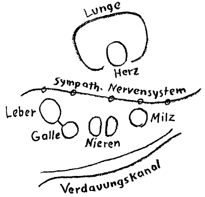 Kao što je žuč povezana s jetrom, tako jetru nalazimo povezanu sa slezenom. Ako uzmemo u obzir te organe, jetru, žučni mjehur i slezenu, moramo reći da su to organi koji se izravno suprotstavljaju protoku ishrane i transformiraju ga, na takav način da postane sposoban uzdići se na više razine ljudske organizacije. Ali oni moraju opskrbljivati i one organe koji se otvaraju prema van, a to rade srce, pluća, pa i sam probavni kanal, ali prije svega organi glave, osjetilni organi.
