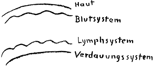 Dakle, s jedne strane, u vanjskom perimetru čovjeka, u sustavu kože, možemo vidjeti nešto transformirano iz drugog sustava, krvnog sustava, koji želim ovdje nacrtati, a u probavnom sustavu također možemo vidjeti transformaciju iz drugog sustava, koji se danas razvija u usponu. Sada moramo pokušati utvrditi nalazimo li ovu uzlaznu i silaznu prirodu organskih sustava već naznačenu kao klicu. I zapravo ispada da cijeli organizam nalazimo naznačen kao klicu - želim to nacrtati shematski - u četiri svitka klice koji leže jedan iznad drugoga, a koji se nazivaju: vanjski svitak klice - ektoderm, unutarnji svitak klice - endoderm, i vanjski i unutarnji srednji svitak - mezoderm.