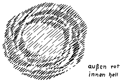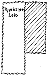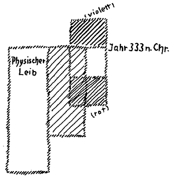 fizičko tijelo (vidi dijagram), etersko tijelo (šrafirano), i u tom eterskom tijelu, prvo se osjeća duševno, ali na takav način da čovjek u početku još uvije živi u eterskom tijelu. Ali zatim u tijelu osjećaja, koje je u stvarnosti još uvijek u potpunosti etersko tijelo. Jer samo je u egipatsko kaldejskom razdoblju čovjek živio u duši, ali tada je duša još uvijek u potpunosti živjela unutar eterskog tijela. Dakle, mogao sam nacrtati dušu nešto poput ovoga (osjenčano crvenom bojom). Budući da se čovjek osjeća unutar duše, još uvijek se napola osjeća unutar eterskog tijela.