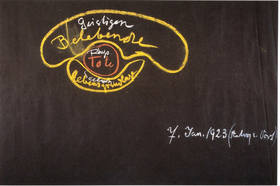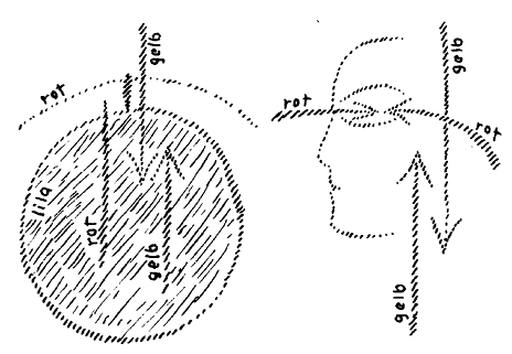 Sve su to podsvjesni dojmovi koji pronalaze izraz samo u općim unutarnjim osjećajima. Dakle, možete reći: ako percepcije iz zemaljskog okruženja dolaze vodoravno i iznutra se susreću s moći predodžbi, tada se metalne percepcije, posebno metalne percepcije, uzdižu odozdo, i baš kao što se moć predodžbi susreće s običnim percepcijama, tako se i osjećaj, za svijest susreće s ovima (crtež ispod lijevo, strelice 'gelb'). Ali za ljude koji danas žive na Zemlji, to ostaje kaotično i nejasno. Pojavljuje se samo opći životni osjećaj.