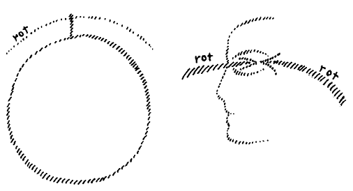 Sada, položaj čovjeka na Zemlji je takav da je lako vidjeti, da bi se glavni smjer u kojem dolaze učinci stvari, tako da dolazi do osjetilnih percepcija, mogao približno nazvati 'vodoravnim'. Detaljnije ispitivanje bi također pokazalo da je tvrdnja koju sam upravo iznio potpuno točna. Jer ako se čini da percipiramo u nekom drugom smjeru, to je samo iluzija. Svaki smjer percepcije u konačnici mora pasti vodoravno. A vodoravna je linija ona koja je usporedna sa Zemljom. Stoga, ako bi crtao shematski, morao bi reći: ako je ovo zemljina površina i na njoj ljudsko biće koje opaža, onda je glavni smjer njegove percepcije ovaj, koji je usporedan sa Zemljom (crtež ispod, lijevo). Sve naše percepcije idu u ovom smjeru.