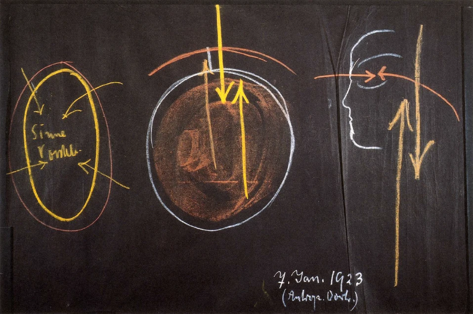 Ljudi tako imaju percepcije metala odozdo, a život osjećaja odgovara tim percepcijama metala. Imamo svoje osjećaje kao protudjelovanje na sve metalno što izvire iz Zemlje i utječe na nas, baš kao što imamo moć predodžbi kao protudjelovanje na sve što u našu osjetilnu percepciju prodire iz okoline. Ali baš kao što učinke metala doživljavamo odozdo, tako i ono što predstavlja kretanje i oblik nebeskih tijela djeluje odozgo, iz kozmičkog prostora. Kao što imamo osjetilnu percepciju u svom okruženju, koja bi funkcionirala kao svijest inspiracije, primamo inspiracije iz svakog planetarnog kretanja, iz konstelacije zvijezda stajaćica. I kao što svojoj moći predodžbi dopuštamo da teče suprotno od naših osjetilnih percepcija, tako dopuštamo i sili da teče suprotno od kretanja nebeskih tijela (crtež ispod, lijevo, žute strelice), sili koja je suprotna dojmovima zvijezda, a ta sila je sila volje. Ono što prebiva u našoj moći volje, doživljavali bismo kao inspiraciju kada bismo razmatrali svijest inspiracije.