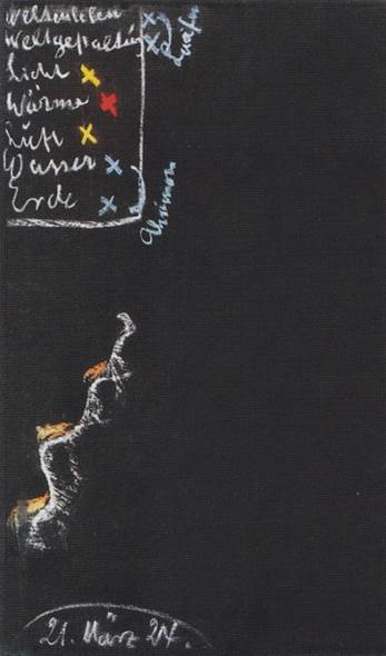 Još dublje, rekao bih, leži čovjekov odnos prema zemljanom elementu, u podsvijesti. [Riječ 'Zemlja' označena je plavim križićem.] Koliko čovjek zna o svom odnosu prema zemljanom elementu? Zna da je sol kisela, da je šećer sladak. To pripada zemljanom elementu. Ali posebne metamorfoze koje sol i šećer prolaze u njegovom organizmu, to kako su povezani s kozmosom u otapanju šećera ili soli unutar njihovog organizma, kako određene sile iz kozmosa utječu na organizam kada slatkoća šećera prolazi kroz naše tijelo ili slanost soli prolazi kroz naše tijelo, ljudi to primjećuju samo kroz ovaj blagi refleks slanosti i slatkoće u svom okusu. Ti procesi koji se odvijaju su duboki. Cijeli svijet, da tako kažemo, otvorio je svoja vrata određenim silama, kada čovjek na jeziku otopi šećer, i prenese ga u svoj organizam.